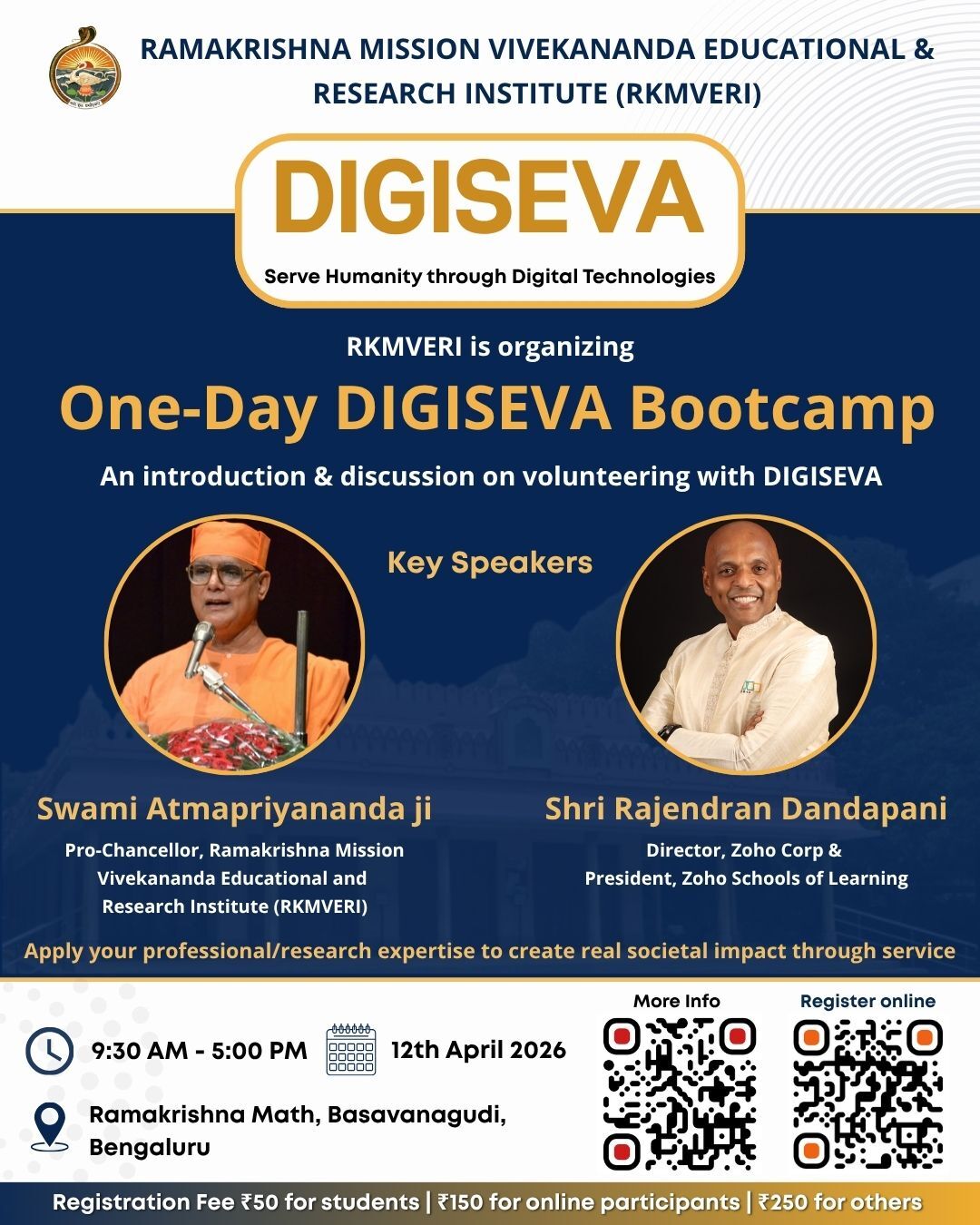 Technology has the power to change the world, but it requires enlightened minds and selfless hearts to put it to proper use. Ramakrishna Mission’s DIGISEVA program, conducted under the auspices of Ramakrishna Mission Vivekananda Education and Research Institute, an institution declared as Deemed to be University by the Government of India under Section 3 of University Grants Commission (UGC) Act, 1956, aspires to realize Swami Vivekananda’s above mantra in the present digital world with increasing AI (Artificial Intelligence) dominance. Here’s inviting the Digi Seva members, fired with the idealism and vision to empower and vitalize all, who are longing to and certainly deserve to participate in this global digital awakening by getting exposed to and trained in the emerging modern digital technologies while being rooted in their own indigenous culture, Bharatiya Jnana Parampara (Indian Wisdom Tradition), as envisioned by Swami Vivekananda through the creation of the University RKMVERI in the sacred precincts of Belur Math. We believe that such a vision, when brought to bear upon the digital revolution happening in the modern age with maddening speed, can alone bring about the much needed course correction to effectively quell the misuse of modern technologies by man’s selfishness, greed and egotism. The most important pre-requisite, sine qua non for the success of the above venture is, according to Swami Vivekananda, men and women, particularly youth with integrated personalities combining the three h’s: heart to feel, head to think and hands to work. In his own words: “Men, men, these are wanted: everything else will be ready, but strong, vigorous, believing young men, sincere to the backbone, a hundred such and the world becomes revolutionized. ” “A hundred thousand men and women, fired with the zeal of holiness, fortified with eternal faith in the Lord, and nerved to Lion’s courage by their sympathy for the poor and the fallen and the downtrodden, will go over the length and breadth of the land, preaching the gospel of salvation, the gospel of help, the gospel of social raising up–the gospel of equality.”